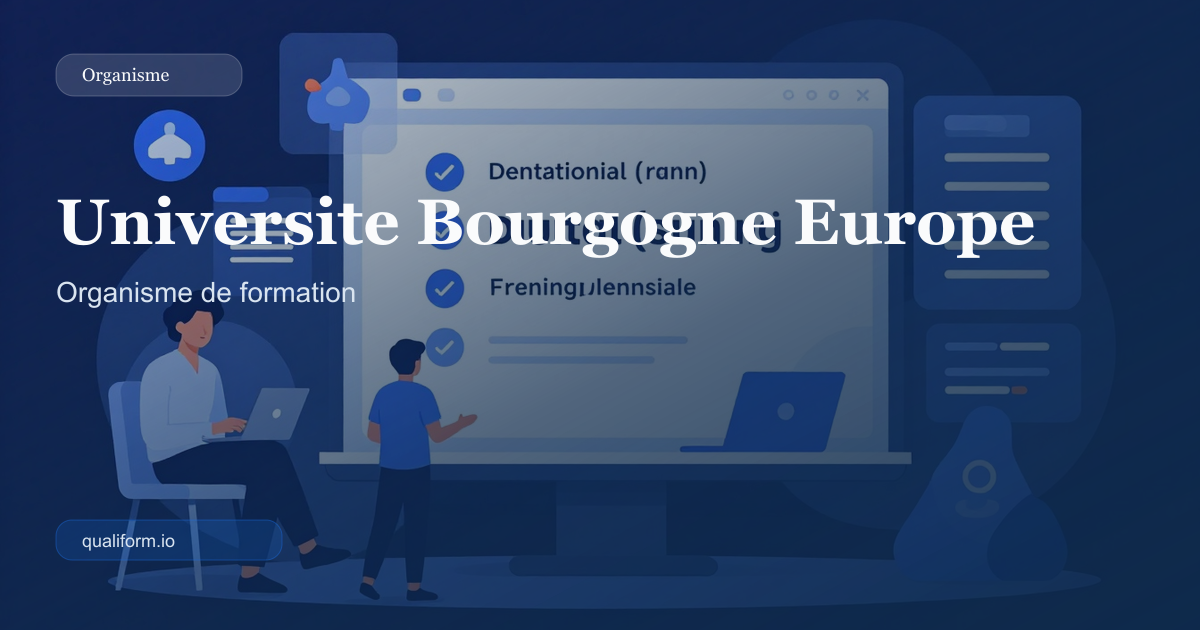 Faits administratifs et catalogue repéré UNIVERSITE BOURGOGNE EUROPE apparaît dans la base avec 9 formations publiées déjà reliées à la fiche. La fiche parent doit donc être lue d'abord comme un point d'entrée vers ce catalogue réel, pas comme une page institutionnelle autonome. SIRET : 93823061200013 NDA : 27210481021 Qualiopi : oui Ville rattachée : ESPLANADE ERASME MAISON DE L'UNIVERSITE Code postal : non renseigné Région : 27 Catalogue repéré : 9 formations Repères visibles: SIRET 93823061200013 ; NDA 27210481021 ; Qualiopi déclarée. Exemples de catalogue déjà publiés Diplôme d'accès aux études universitaires A (Littéraire) - presentiel - 1 300 € - preparation-entree-universite Diplôme d'accès aux études universitaires B (Scientifique) - presentiel - 2 000 € - preparation-entree-universite Diplôme d'état Infirmier en Pratique Avancée - Année 2 - Mention Psychiatrie et Santé Mentale - presentiel - 6 500 € - infirmier Licence 3ème année Mention administration économique et sociale - Parcours AGE - presentiel - 1 200 € - gestion-des-organisations Licence 3ème année Sociologie - presentiel - 1 200 € - sociologie Diplôme d'accès aux études universitaires A (Littéraire) fait partie de l'échantillon publié par UNIVERSITE BOURGOGNE EUROPE avec la certification Diplôme d'accès aux études universitaires (DAEU) (Fiche nationale). Dans le catalogue repéré, Diplôme d'accès aux études universitaires B (Scientifique) ressort avec presentiel, 2 000 € et preparation-entree-universite. Diplôme d'état Infirmier en Pratique Avancée - Année 2 - Mention Psychiatrie et Santé Mentale fait partie de l'échantillon publié par UNIVERSITE BOURGOGNE EUROPE avec la certification DE Infirmier en pratique avancée. Licence 3ème année Mention administration économique et sociale - Parcours AGE fait partie de l'échantillon publié par UNIVERSITE BOURGOGNE EUROPE. Licence 3ème année Sociologie fait partie de l'échantillon publié par UNIVERSITE BOURGOGNE EUROPE. L'échantillon montre déjà la combinaison des modalités presentiel, des domaines preparation-entree-universite, infirmier, gestion-des-organisations, sociologie, methode-physico-chimique-analyse et des prix observés entre 1 200 € à 6 500 €. Positionnement lisible à partir des formations Modalités repérées : presentiel Plage de prix observée : 1 200 € à 6 500 € Prix moyen sur l'échantillon : 2 696 € Domaines visibles : preparation-entree-universite, infirmier, gestion-des-organisations, sociologie, methode-physico-chimique-analyse Formations certifiantes vues : 4 Diplôme d'accès aux études universitaires (DAEU) (Fiche nationale) DE Infirmier en pratique avancée Licence Professionnelle Métiers de la GRH : formation, compétences et emploi (fiche nationale) diplôme accès études universitaires littéraire preparation entree universite daeu nationale scientifique état infirmier pratique avancée année mention psychiatrie Titres repérés dans l'échantillon: Diplôme d'accès aux études universitaires A (Littéraire); Diplôme d'accès aux études universitaires B (Scientifique); Diplôme d'état Infirmier en Pratique Avancée - Année 2 - Mention Psychiatrie et Santé Mentale; Licence 3ème année Mention administration économique et sociale - Parcours AGE; Licence 3ème année Sociologie; Licence 3 Mention Sciences de la Vigne et du Vin - Parcours Sciences de la vigne et de la viticulture durable; Licence professionnelle Mention métiers de la GRH : Formation, Compétences et emploi - Parcours formateur en milieu professionnel; MASTER 2ème année Mention économie de la santé - Parcours management et évaluation dans les organisations de santé (MEOS en 1 an). Sur cet échantillon, UNIVERSITE BOURGOGNE EUROPE montre déjà une logique de catalogue précise: les modalités presentiel, des prix observables entre 1 200 € à 6 500 € et des domaines comme preparation-entree-universite, infirmier, gestion-des-organisations, sociologie. Dans l'échantillon visible, UNIVERSITE BOURGOGNE EUROPE aligne déjà Diplôme d'accès aux études universitaires A (Littéraire), Diplôme d'accès aux études universitaires B (Scientifique) et Diplôme d'état Infirmier en Pratique Avancée - Année 2 - Mention Psychiatrie et Santé Mentale. Même limité, cet assemblage donne un angle catalogue concret qui évite de réduire l'organisme à sa seule fiche administrative. Les domaines repérés restent preparation-entree-universite, infirmier, gestion-des-organisations et sociologie. Cette combinaison doit guider la lecture du catalogue avant toute généralisation sur des spécialités qui ne sont pas visibles dans le snapshot retenu. Le repère géographique exploitable reste ESPLANADE ERASME MAISON DE L'UNIVERSITE, département 21, région 27. Ce signal est utile pour distinguer cette fiche d'autres têtes de réseau proches. Le rattachement universitaire visible dans le nom place la fiche dans une logique d'établissement d'enseignement supérieur. Les formations liées doivent donc être lues comme des parcours académiques ou diplômants avant d'être comparées à des stages courts de centre privé. Toutes les modalités visibles dans cet échantillon relèvent actuellement du presentiel. Ce constat ne vaut que pour les lignes observées, mais il fournit un repère immédiat sur l'organisation de l'offre publiée.